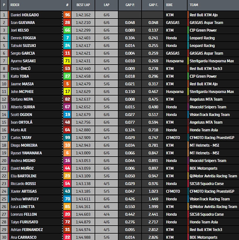 A l’issue de cette séance de Warm Up, alors que le classement n’a fait que bouger durant ces 10min, Daniel Holgado (KTM, Red Bull KTM Ajo, #96) termine en tête, en 1’42.162, devant Izan Guevara (GasGas, GasGas Aspar Team, #28) et Joel Kelso (KTM, CIP-Green Power, #66).