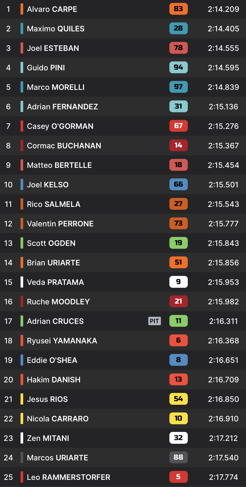 Maximo Quiles n’avait bien entendu pas dit son dernier mot. À quelques minutes du terme, il venait claquer un temps en 2:14.405, sept dixièmes plus rapide que n’importe lequel de ses adversaires, pour reprendre les commandes au marquoir.