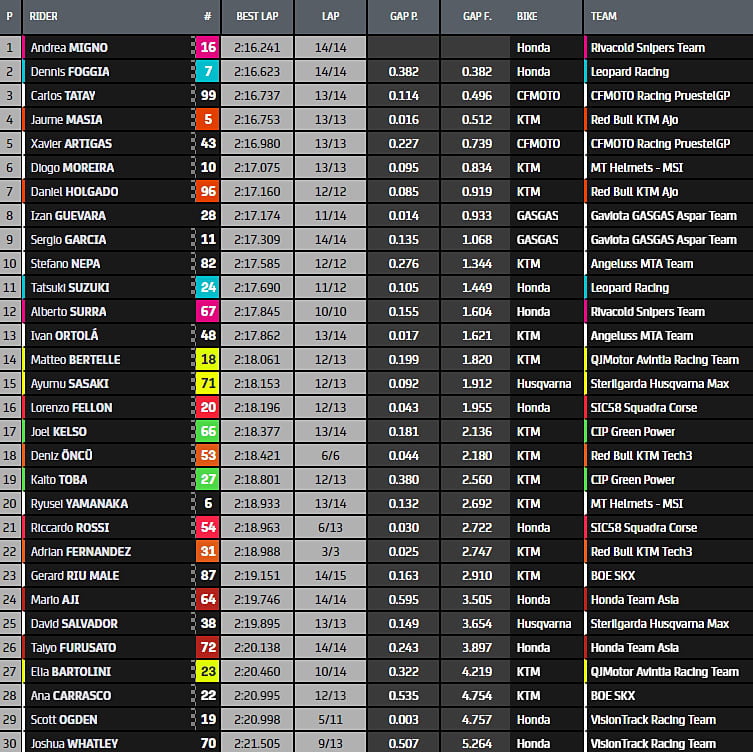 Alors qu’il ne reste plus que 10min avant la présentation du drapeau à damiers, Dennis Foggia (Honda, Leopard Racing, #7) a repris les commandes en 2’17.222, devant Andrea Migno (Honda, Rivacold Snipers Team, #16) et Xavier Artigas (CFMoto, CFMoto Racing PruestelGP, #43). Lorenzo Fellon (Honda, SIC58 Squadra Corse, #20) pointe à la 9e position, à un peu plus d’une seconde du leader.