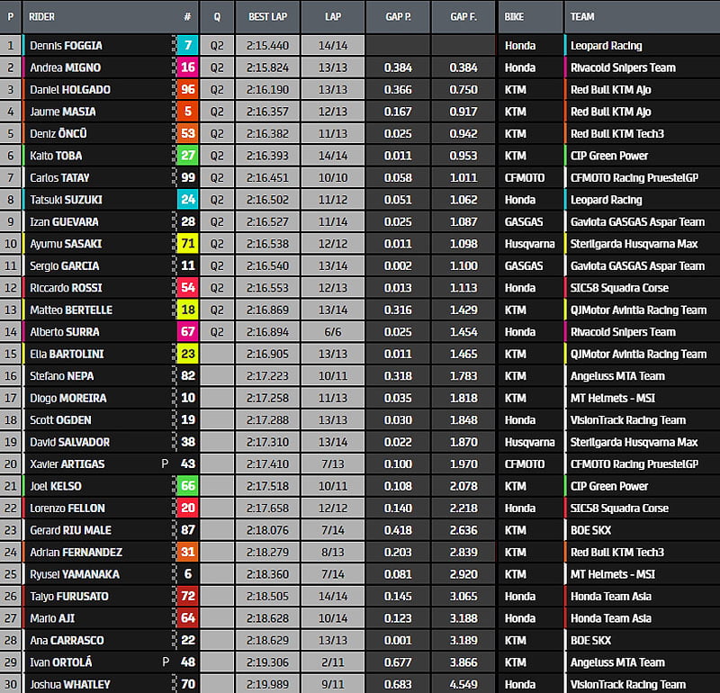 Lors des dernières minutes, de nombreux chronos sont améliorés, et au passage sous le drapeau à damiers, Dennis Foggia (Honda, Leopard Racing, #7) a réalisé un chrono impressionnant de 2’15.440, qui relègue Andrea Migno (Honda, Rivacold Snipers Team, #16) à 0.384s, ce sont les 2 pilotes à être descendu sous les 2’16. Daniel Holgado (KTM, Red Bull KTM Ajo, #96) termine 3e, à 0.750s du leader.