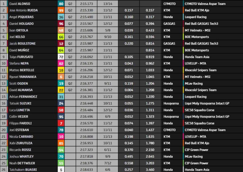 José Antonio Rueda est deuxième, Angel Piqueras, le rookie au n°36 évoquant Joan Mir, troisième. Belle performance de ce dernier. Les pilotes auront une nouvelle chance de se qualifier demain à 15 h 40 !