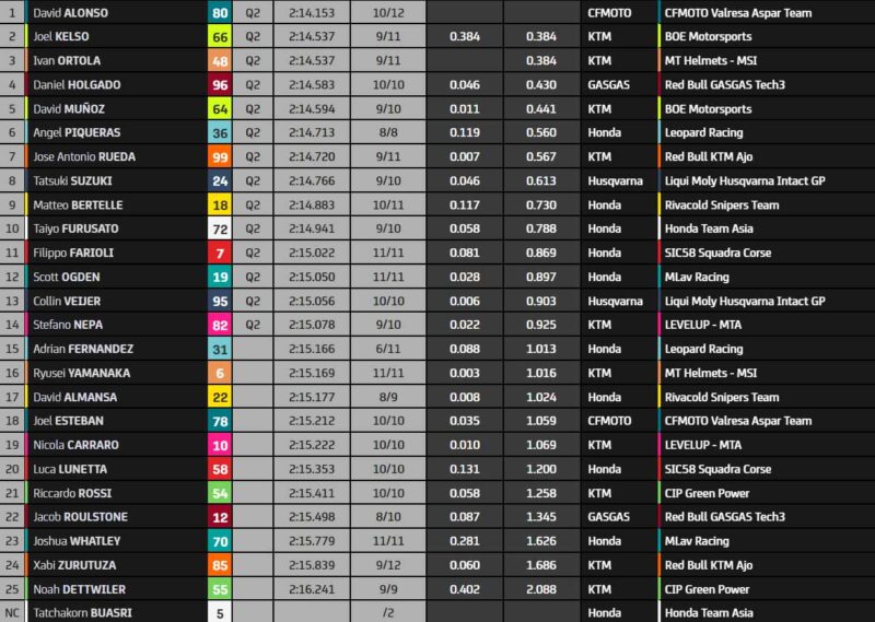 Collin Veijer (Liqui Moly Husqvarna Intact GP) améliore à son tour, et se qualifie provisoirement pour la Q2. David Alonso ne ralentit pas. Il est clairement au dessus du lot depuis le début du week-end. À 15 minutes du terme, il possède une demi-seconde d’avance… avant qu’un pilote inattendu ne vienne le challenger ! Matteo Bertelle (Honda Snipers Team) passe aussi en 2’14, à seulement un dixième d’Alonso. Il est suivi par Adrian Fernandez (Honda Leopard Racing).