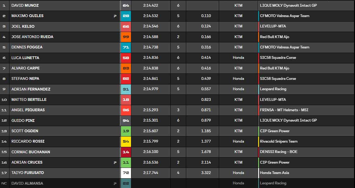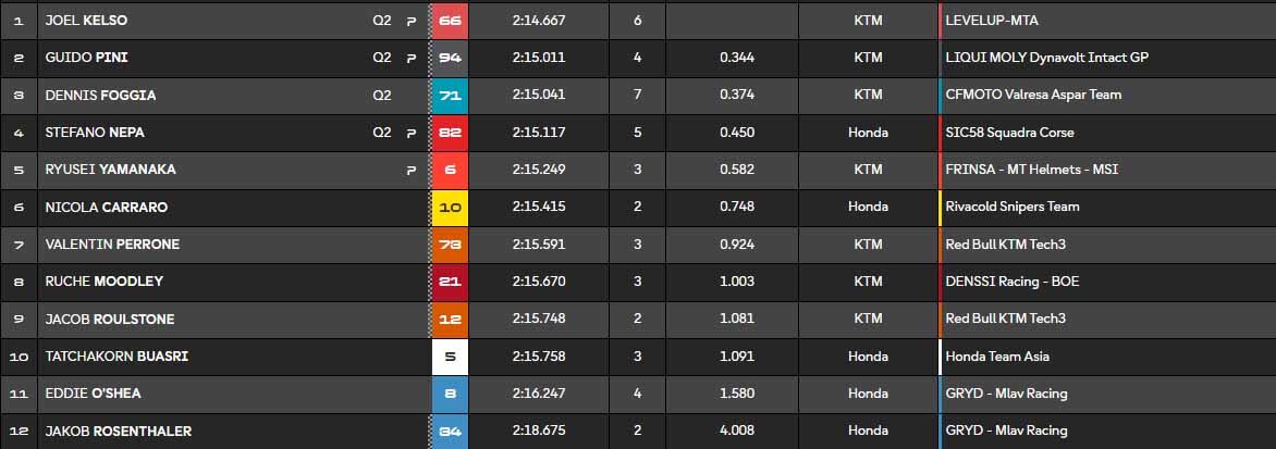 Finalement, les quatre qualifiés pour la Q2 sont Joel Kelso, Guido Pini, un surprenant Dennis Foggia (KTM CFMoto Aspar Team), et Stefano Nepa (Honda Sic58 Squadra Corse).