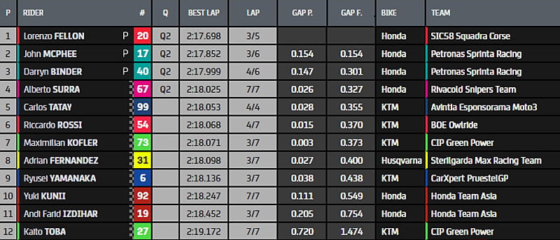A la fin de cette Q1, Lorenzo Fellon (Honda, SIC58 Squadra Corse, #20) conserve l’avantage et se qualifie en Q2, accompagné de John McPhee (Honda, Petronas Sprinta Racing, #17), Darryn Binder (KTM, Petronas Sprinta Racing, #40) et Alberto Surra (Honda, Rivacold Snipers Team, #67). Carlos Tatay (KTM, Reale Avintia Moto3, #99) se hisse à la 5e place de la séance, une belle performance en un unique tour chrono après sa chute.