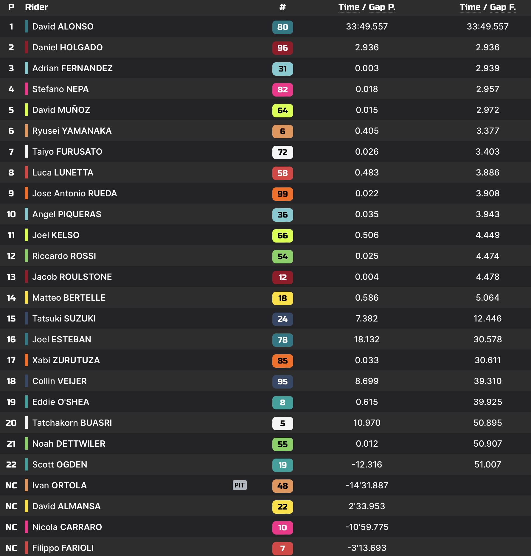 David Alonso et Adrian complètent le podium, tandis que Stefano Nepa revient de la douzième à la quatrième place en l’espace de deux tours, pour terminer à 18 millièmes du podium. Le top-10, complété par Angel Piqueras, se tient en moins de quatre secondes à l’arrivée. Il n’y avait toutefois qu’une seconde d’écart entre la deuxième et la dixième place.