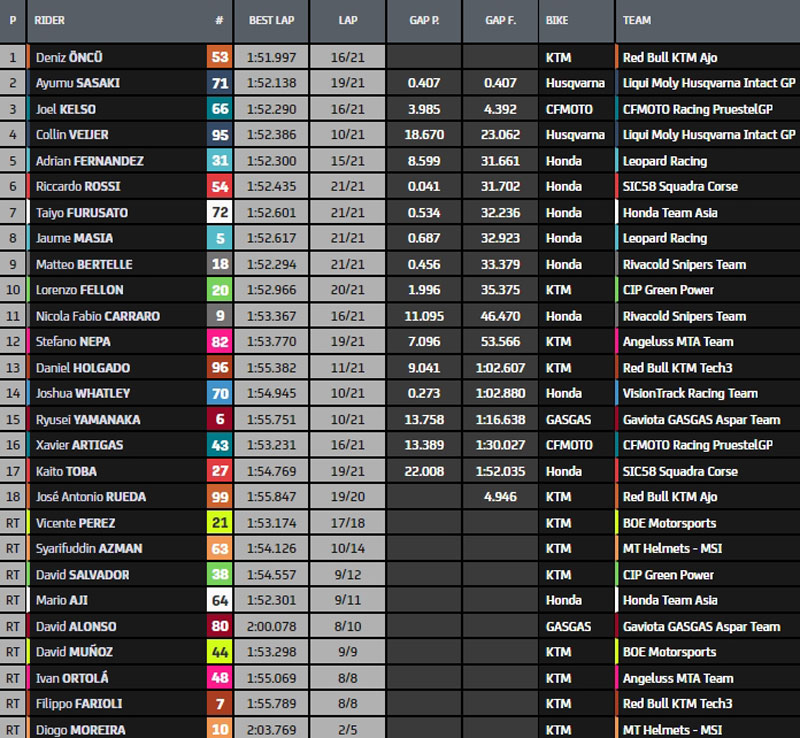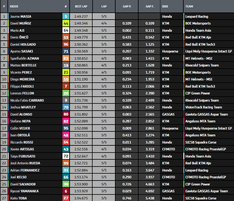 Deuxième ligne pour Diogo Moreira (KTM MT Helmets-MSI, vainqueur à Mandalika), pour Matteo Bertelle (Rivacold Snipers Team) et Collin Veijer (Liqui Moly Husqvarna Intact GP). Septième temps et troisième ligne pour Deniz Öncü (KTM Red Bull Ajo), qui aura à ses côtés David Alonso (Gaviota GASGAS Aspar Team) et Adrian Fernandez (Leopard Racing). Vicente Perez, qui remplace Ana Carrasco blessée au sein du Team BOE KTM, est dixième, devant Daniel Holgado (Angeluss MTA Team, repêché en Q1) et Ivan Ortolà (Angeluss MTA Team).