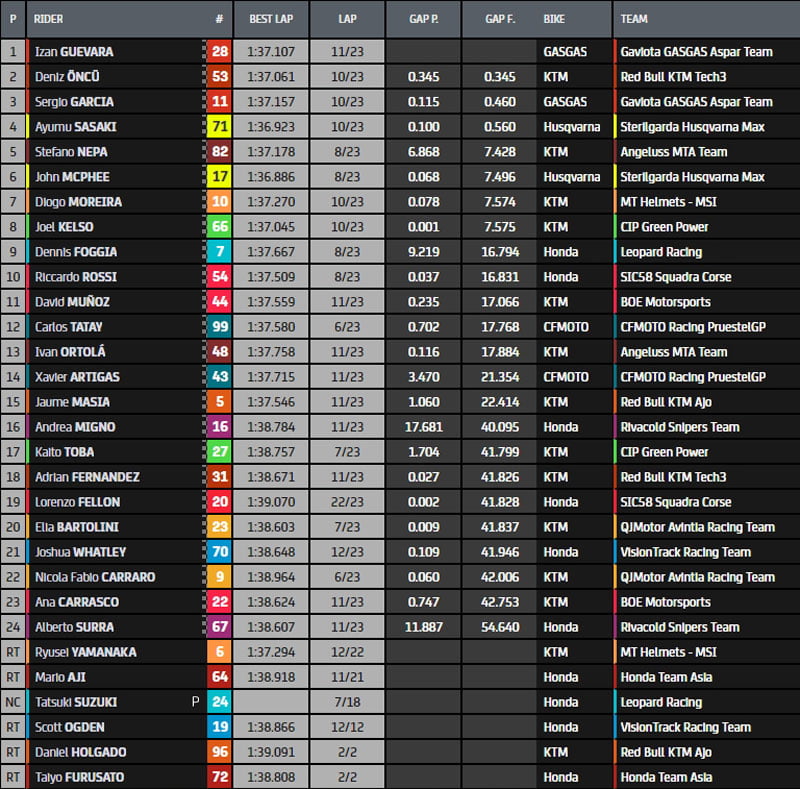 Le leader du championnat, Izan Guevara, s’est qualifié en septième position, ce qui est la huitième fois cette année qu’il n’a pas réussi à se qualifier parmi les six premiers. Il doit marquer 2 points de plus que Dennis Foggia, ne pas concéder plus de 6 points à Sergio Garcia et ne pas perdre de points et 20 à Ayumu Sasaki pour devenir 2022 Champion du Monde Moto3 ce dimanche.