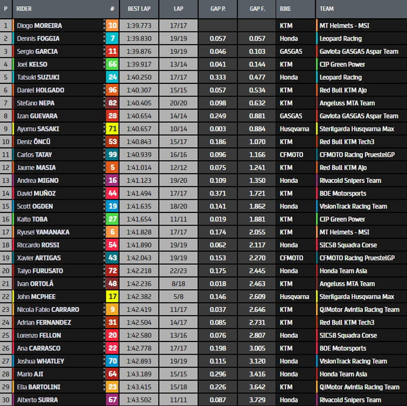 Tatsuki Suzuki reprend le leadership à quatre minutes du drapeau à damier, en 1’40.250, alors que Daniel Holgado (Red Bull KTM Ajo) bondit de la 19e à la troisième position.