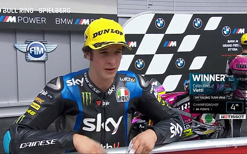 Celestino Vietti (1er) : « C’est difficile de parler de cette course, il y a beaucoup d’émotion. Ca a été une course compliquée. Au début je me suis retrouvé derrière et ça n’est pas facile de remonter mais on a passé un cap par rapport à la semaine dernière et j’avais un meilleur rythme aujourd’hui. Les trois derniers tours j’ai attaqué le plus possible pour être devant parce que Tony était très rapide notamment dans virage 4. Ce sentiment est incroyable, je crois que c’est le meilleur jour de ma vie ! Je souhaite remercier toute ma famille car sans eux tout ça aurait été impossible, et l’équipe a fait de l’excellent travail. »