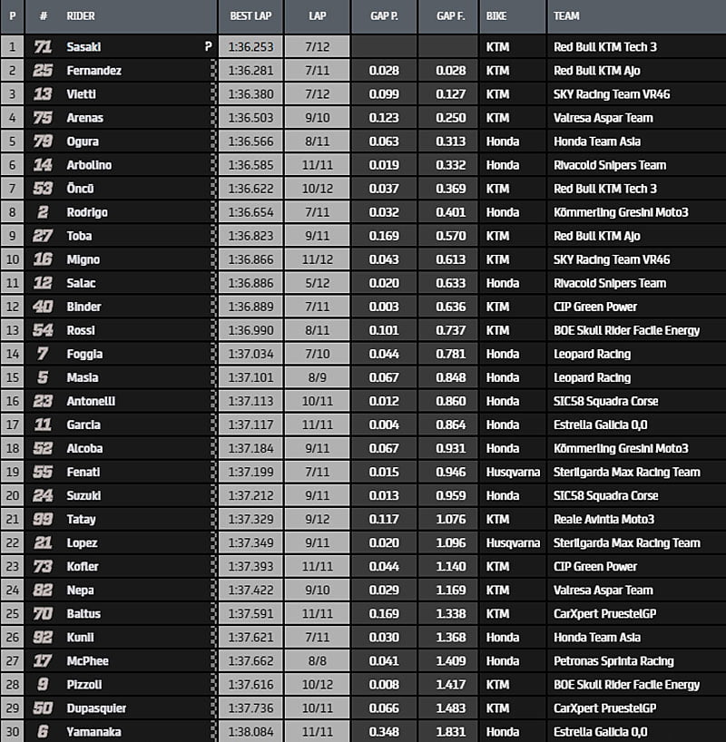 A l’issue de ce Warm-Up, le plus rapide en piste aura été le pilote Tech3, Ayumu Sasaki, devant Raúl Fernández (KTM, Red Bull KTM Ajo) et Celestino Vietti (KTM, Sky Racing Team VR46).