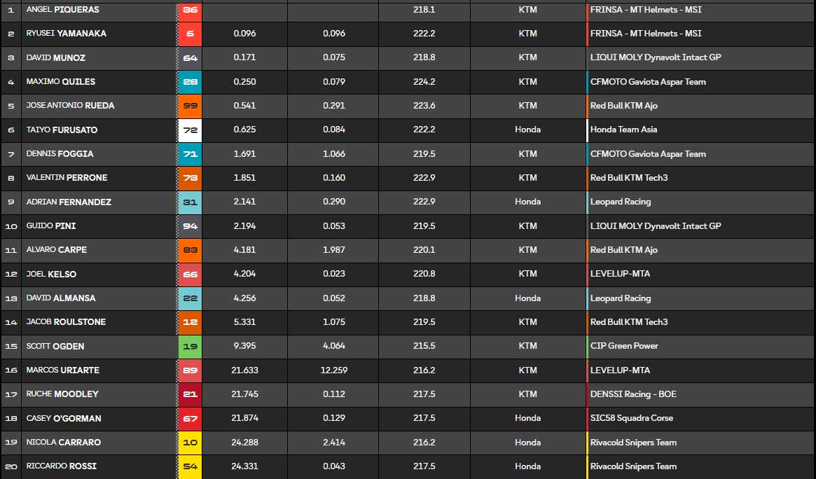 Finalement, au bout du suspense, Angel Piqueras s’impose pour un rien face à Ryusei Yamanaka ! David Munoz, qui s’est fait doubler par le Japonais dans l’avant dernier virage, est troisième. Maximo Quiles et José Antonio Rueda sont respectivement quatrième et cinquième.