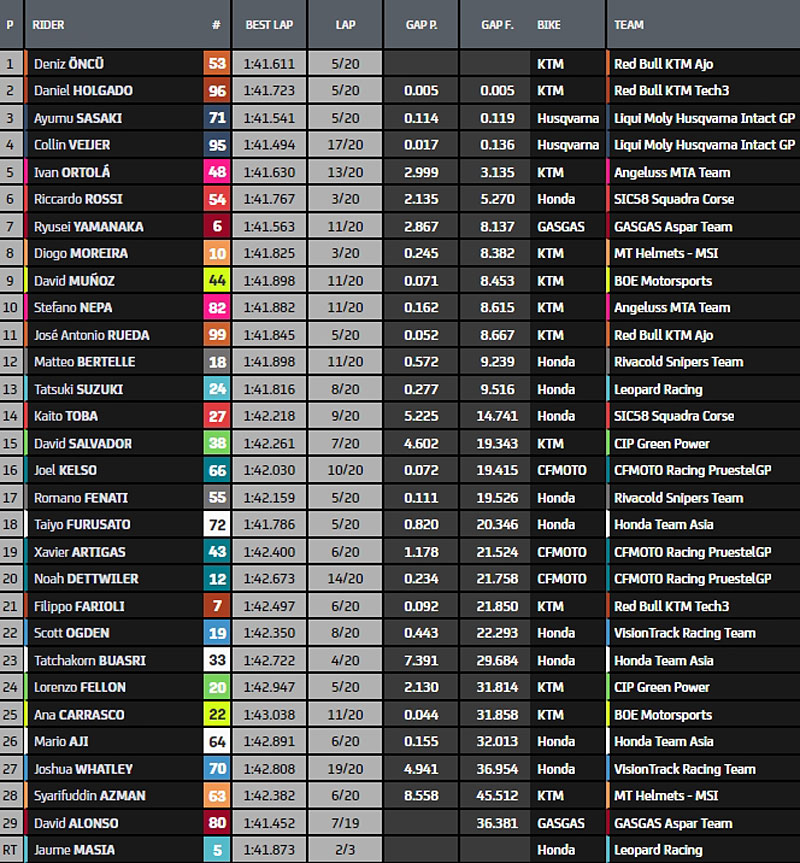 Joshua Whatley (Honda VisionTrack Racing) écope à son tour d’un long lap, puis d’un deuxième son compatriote et coéquipier Scott Ogden également. Ayumu Sasaki est désormais deuxième, en chasse. Collin Veijer est à l’arrière de ce groupe de quatre ; il peine à suivre les trois ténors. Le Japonais s’empare de la première position, mais il est connu pour ses faibles défenses dans le dernier tour. Rien n’est fait. À noter le très bon retour d’Iván Ortolá (KTM Angeluss MTA Team), bientôt cinquième après une qualification ratée. Daniel Holgado reprend, une fois de plus, la première position. Clairement, il semble être le plus fort aujourd’hui.