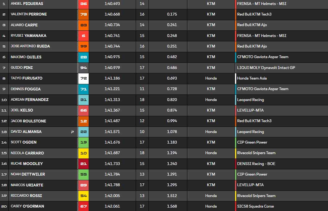 Angel Piqueras est vraiment en grande forme, personne ne peut le déloger. Finalement, il termine cette séance en tête, devant le rookie Valentin Perrone (Red Bull KTM Tech3) et Alvaro Carpe (Red Bull KTM Ajo).
