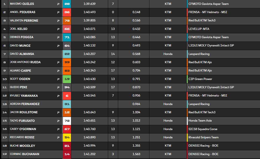 Le début de séance est assez animé, alors que Maximo Quiles (KTM CFMoto Aspar Team) prend la première position provisoire. Cormac Buchanan (KTM Denssi Boé) chute à son tour. Maximo Quiles est vraiment en feu ! Il bat le record du tour établi hier par Angel Piqueras, et ne ralentit pas pour autant. L’autre rookie Valentin Perrone (Red Bull KTM Tech3) reste au contact depuis le début de séance, il n’est pas à sous-estimer.