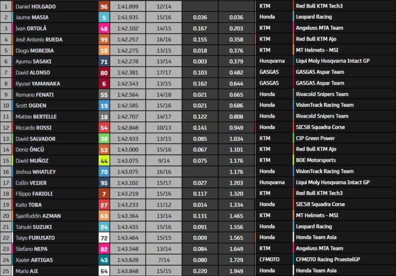 Daniel Holgado rétablit l’ordre, avec le premier tour sous la barre des 1’42. Il termine cette première séance en tête. Il devance Jaume Masiá et Iván Ortolá, alors que José Antonio Rueda pointe quatrième.
