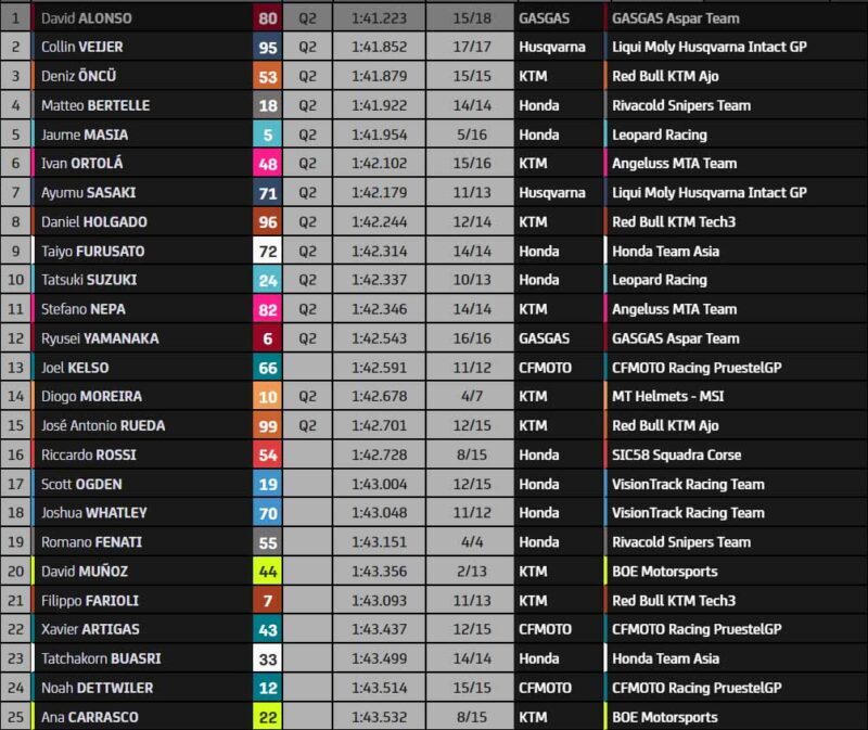 Déjà en vue ce matin, le rookie José Antonio Rueda (Red Bull KTM Ajo) est le premier à dégainer. Mais il est bientôt rattrapé par Daniel Holgado, rapide comme à son habitude. Jaume Masiá n’est pas loin, et il s’agit de la seule Honda en vue depuis ce matin. Sur un tracé appartenant à KTM, il semble être le seul en mesure de dégouter les employés de la firme de Mattighofen.