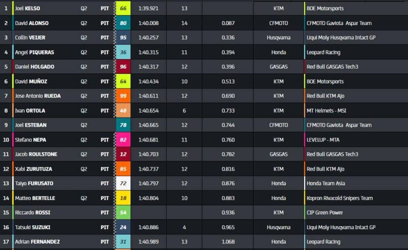 Vicente Perez (Honda MLav Team) est tombé, ce qui provoque la sortie des drapeaux jaunes. Cela n’empêche pas le bon tour d’Angel Piqueras, qui s’illustre sans pouvoir battre Kelso cependant. Autre chute pour Joel Esteban (CFmoto Aspar Team), ce qui signifie la fin de cette session. Joel Kelso termine donc en tête, juste devant David Alonso, qui s’est réveillé dans les derniers instants. Collin Veijer est troisième.