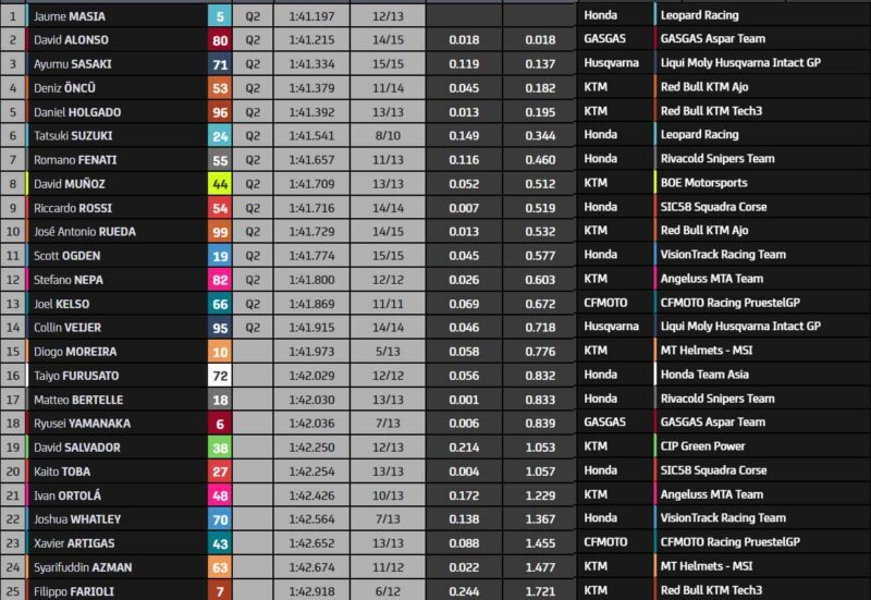 Bien sûr, la course à la Q2 est plus d’actualité que jamais. Riccardo Rossi (Honda Sic58 Squadra Corse) est 14e, synonyme de dernière place du groupe Q2. Il doit pousser pour s’assurer une place plus confortable.
