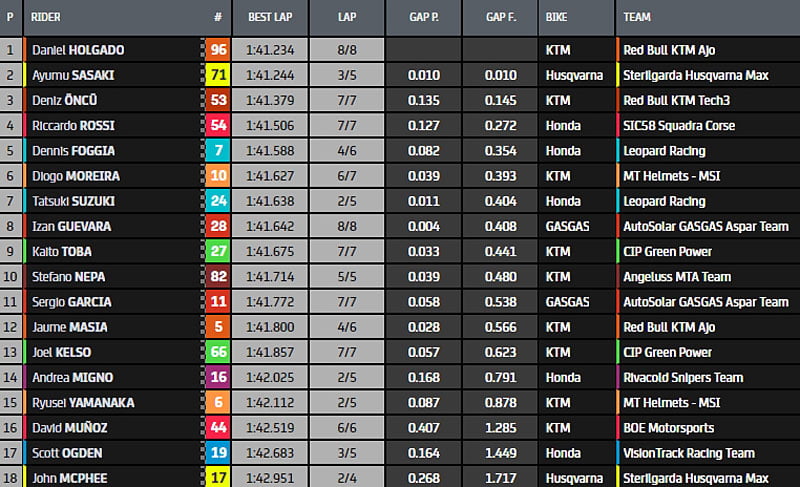 Troisième et quatrième temps pour Izan Guevara (GasGas Aspar) et Dennis Foggia (Honda Leopard), avec le pilote romain tout juste sorti de la victoire à Silverstone. Sergio Garcia avec la seconde GasGas de Team Aspar est cinquième, devant le rookie Diogo Moreira (KTM MT Helmets -MSI), John McPhee (Husqvarna Max Racing Team), Stefano Nepa (KTM MTA), le rookie Daniel Holgado (KTM Red Bull Ajo ) et le Japonais Kaito Toba (KTM CIP), qui clôture le Top Ten.