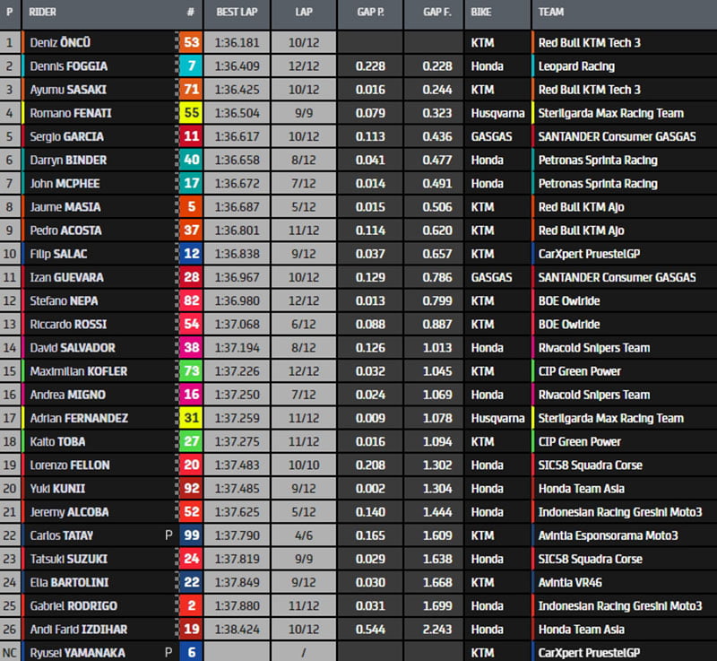 Fin de session et c’est Oncü qui tire les marrons du feu avec son chrono en 1.36.181s. Foggia, Sasaki, Fenati et Garcia ferment la marche du top5.