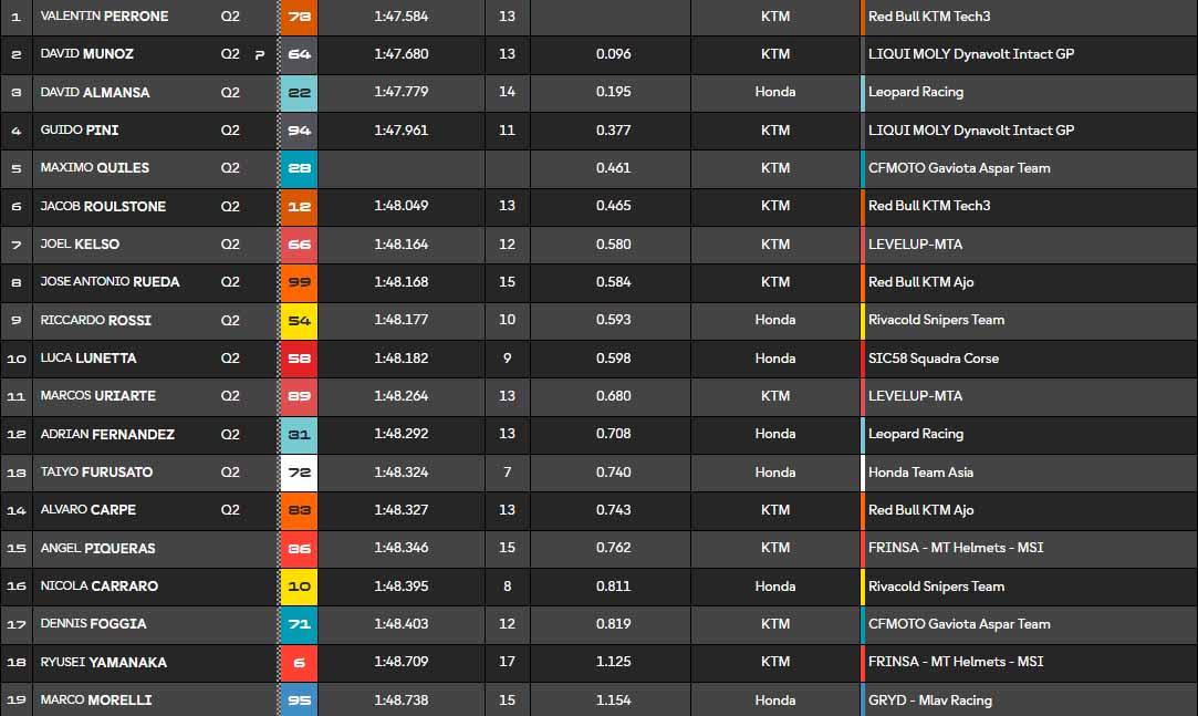 Finalement, Valentin Perrone conclut la séance en tête, quel rookie ! David Munoz, qui était en difficulté jusque dans les derniers instants, s’en sort bien. David Almansa est troisième. En revanche, deux favoris seront en Q1 ! Ryusei Yamanaka (KTM MT Helmets MSi), et Angel Piqueras, de la même équipe, sont relégués !
