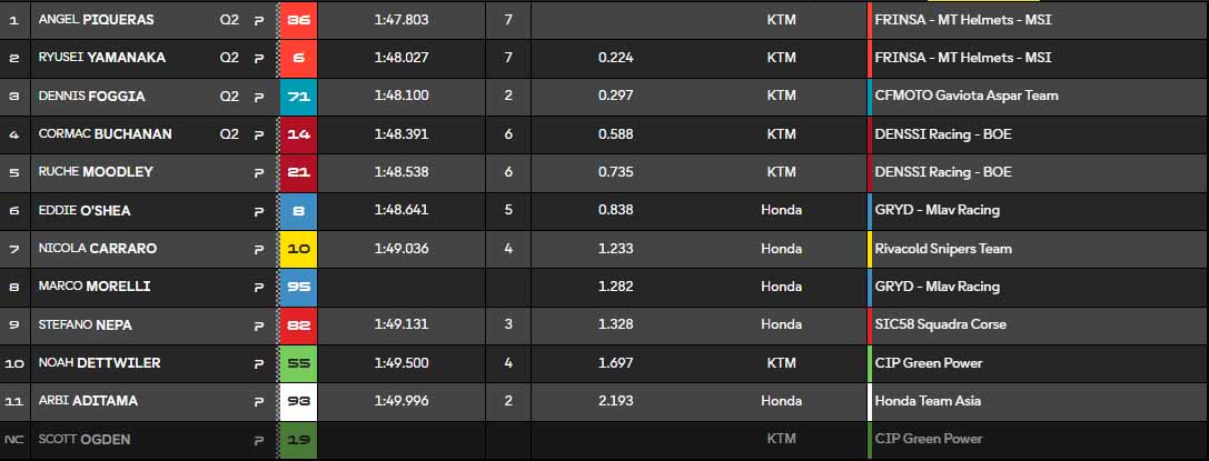 Finalement, sans grande surprise, Angel Piqueras termine en tête de cette session préliminaire. Il sera rejoint en Q2 par Ryusei Yamanaka, Dennis Foggia (KTM CFMoto Aspar Team), et Cormac Buchanan (KTM Denssi Boé). Scott Ogden (KTM CIP Green Power) n’a pas inscrit le moindre chrono.