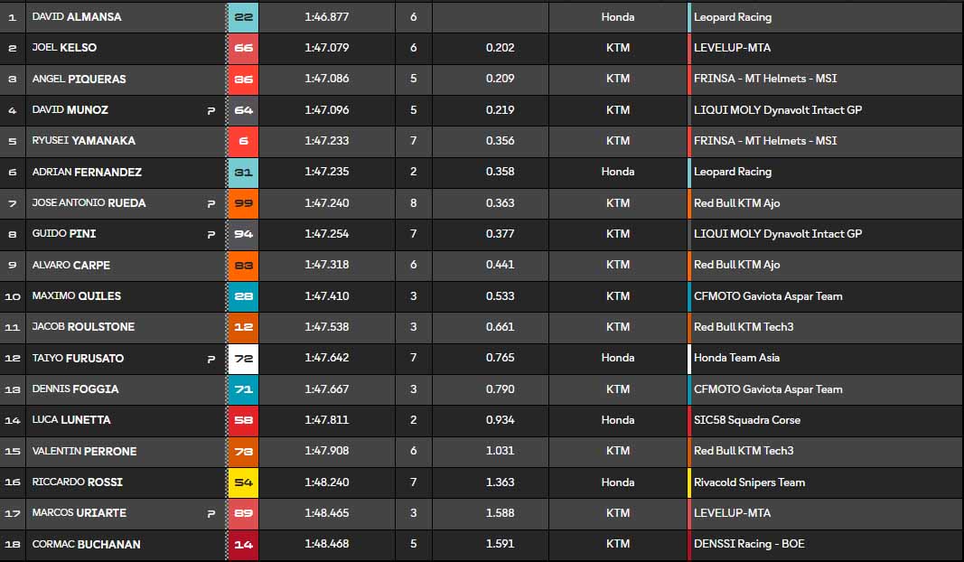 Lors de la deuxième salve, Joel Kelso (KTM Levelup MTA) fait encore mieux, avant que David Almansa (Honda Leopard Racing) ne réalise le premier 1’46 du week-end ! Almansa, qui n’a pas connu l’année espérée jusqu’à maintenant, peut y arriver. Et finalement, Almansa prend cette pole position, juste devant Joel Kelso et Angel Piqueras ! David Munoz et José Antonio Rueda complètent le top 5. Quelle surprise ! Il s’agit, tout simplement, de sa première en Moto3.