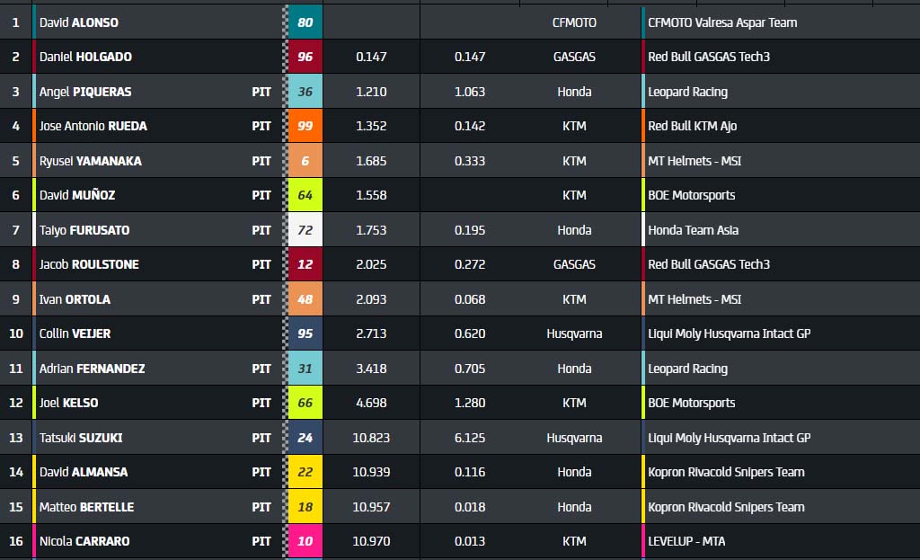 Alors que David Alonso glisse à la huitième place, Daniel Holgado parvient à conserver la tête plusieurs tours durant. Et si c’était son heure ? Un tel résultat lui assurerait de la deuxième place au championnat. Dans le même temps, Luca Lunetta (Honda Sic58 Squadra Corse) écope d’un double long lap de pénalité pour comportement irresponsable.