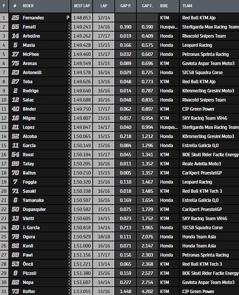 Dès le début de la séance, on assiste à une passe d’armes à coup de chronos interposés entre Tony Arbolino et Romano Fenati (Husqvarna, Sterilgarda Max Racing Team), dernier vainqueur en date.