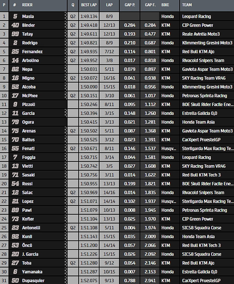 Albert Arenas, toujours leader au Championnat pour deux petits points, Niccolò Antonelli et Kaito Toba héritaient quant à eux des sixième, septième et huitième places. Gabriel Rodrigo et Filip Salac  complétaient le Top 10.