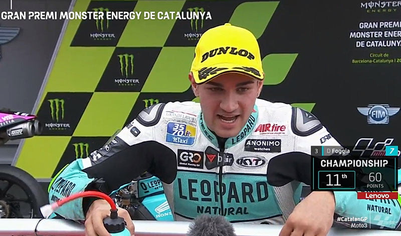 Dennis Foggia (3e) : « Cette course était folle, surtout le dernier tour ! Avec Binder ma moto bougeait beaucoup. Mes pneus n’étaient plus bons dans les derniers tours mais j’ai attaqué. Je suis très content, pour moi et aussi pour l’année prochaine car je serai encore avec l’équipe Leopard. Je voudrais les remercier eux et ma famille. »
