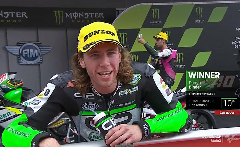 Darryn Binder (1er) : « Ce feeling est absolument indescriptible ! C’est un endroit spécial car j’ai pris mes premiers points ici en 2016, c’était important que ça se passe ici. J’ai galéré pendant longtemps et aujourd’hui j’avais absolument tout pour gagner. Je ne pourrais jamais remercier assez les gars, je suis sur un nuage. Merci, je vous aime les gars ! »