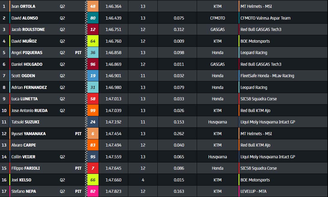 Les dernières secondes sont haletantes… et finalement, de nulle part, c’est Ivan Ortola qui sort le meilleur temps ! Il devance David Alonso et un solide Jacob Roulstone (Red Bull GasGas Tech3).