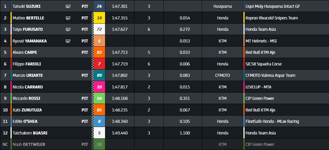 Finalement, personne n’arrive à entrer dans le top 4 qui permet une accession en Q2. Suzuki est suivi de Matteo Bertelle, Taiyo Furusato et Ryusei Yamanaka. Alvaro Carpe, pour sa première apparition, manque cette ultime séance de qualifications pour un rien.