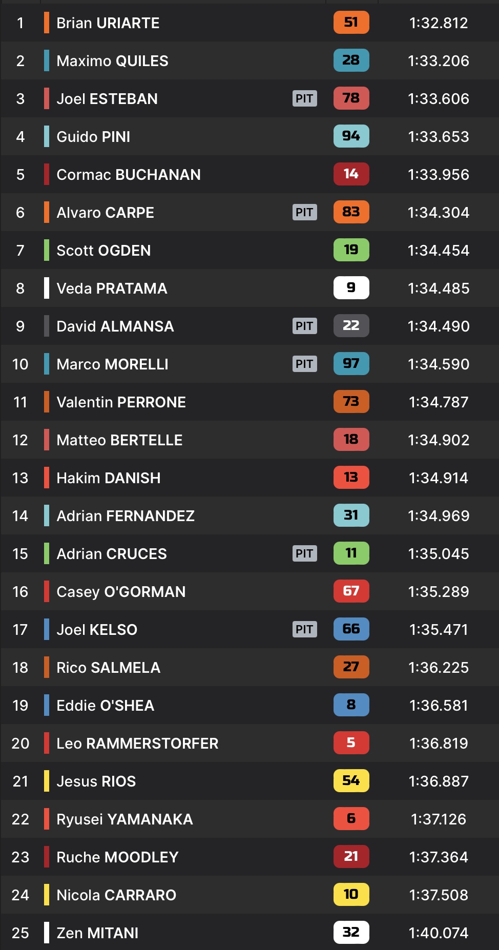 C’est Brian Uriarte qui aura le dernier mot. Auteur d’un temps en 1:32.812, le pilote KTM Ajo remporte la FP1 devant Maximo Quiles et Joel Esteban. Les temps au tour ne sont cependant pas significatifs de la hiérarchie en place, la séance n’ayant pas eu lieu dans des conditions normales.