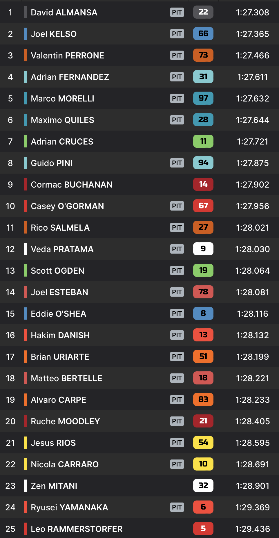 Devant le drapeau à damier, David Almansa surprend le peloton et coupe la ligne en 1:27.308 pour signer une énième référence sur le circuit de Goiania. Déjà le plus rapide la veille, lors de la Practice, le pilote Intact GP démontre une belle capacité d’adaptation au nouveau circuit dans toutes les conditions. Joel Kelso et Valentin Perrone complète le top 3.