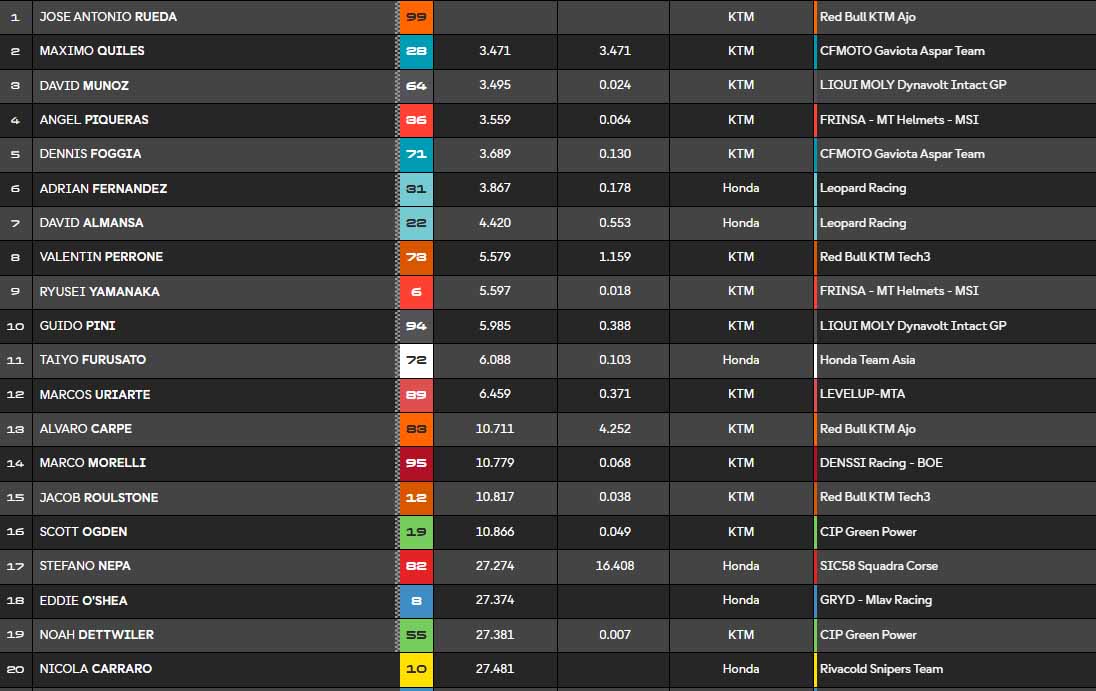 À mesure que les tours défilent, José Antonio Rueda s’éloigne progressivement de Maximo Quiles. Derrière, Dennis Foggia s’accroche, mais a toutes les peines du monde à le suivre. Rueda compte désormais une seconde d’avance.