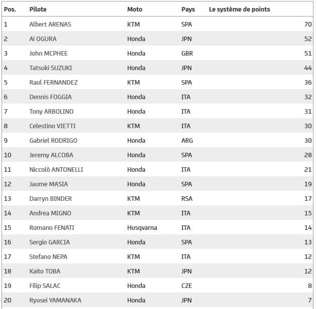 Classement provisoire du Championnat du Monde après le Grand Prix de la République Tchèque Moto3 :