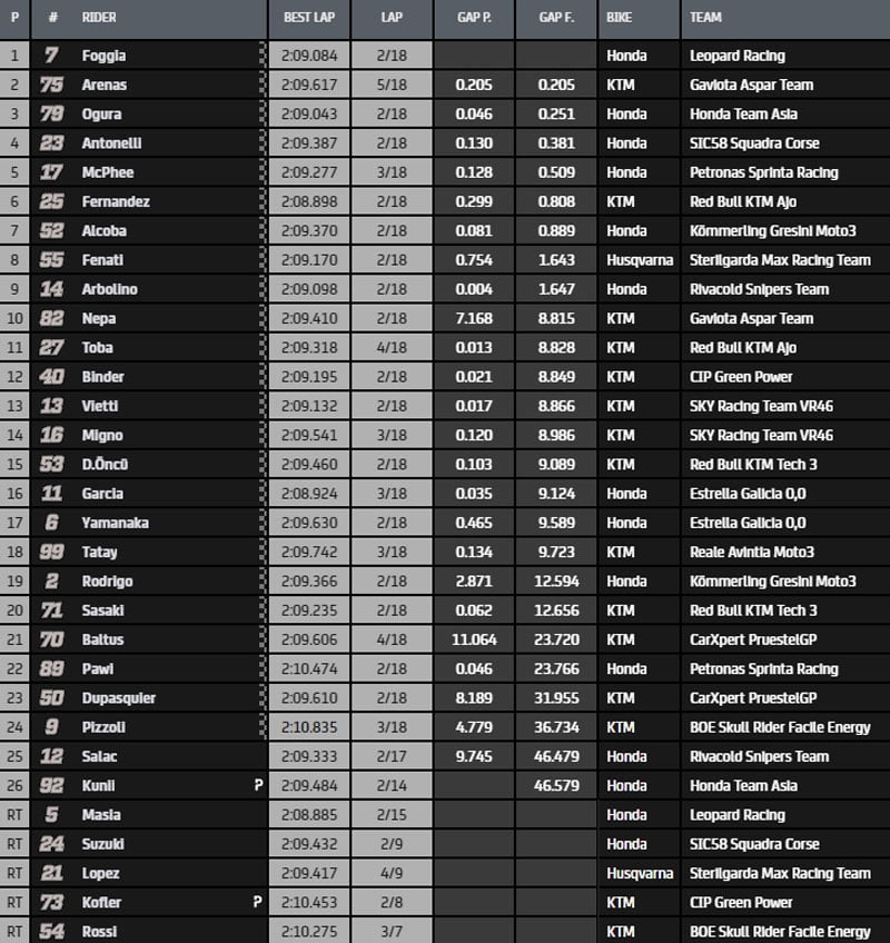 Dennis Foggia (Honda, Leopard Racing) a pris le contrôle de la course et l’emporte devant Albert Arenas qui conserve la tête du Championnat. Ai Ogura (Honda, Honda Team Asia) complète le podium.