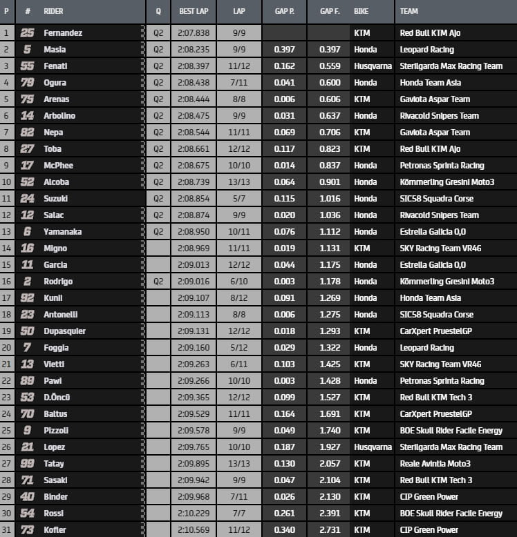 Au classement combiné, pour un dixième, l’Argentin Gabriel Rodrigo se maintient ainsi en tête, devant Kaito Toba (KTM, Red Bull KTM Ajo), tandis que Raúl Fernández reste troisième au combiné. Dennis Foggia (Honda, Leopard Racing) conserve son quatrième temps, son co-équipier Jaume Masia venant donc s’intercaler entre Ayumu Sasaki (KTM, Red Bull KTM Tech3) et lui. Tony Arbolino (Honda, Rivacold Snipers Team), le leader au Championnat Albert Arenas (Honda, Gaviota Aspar Team) et John McPhee (Honda, Petronas Sprinta Racing) complètent à ce stade le Top 10, en compagnie de Romano Fenati (Husqvarna, Sterilgarda Max Racing Team).