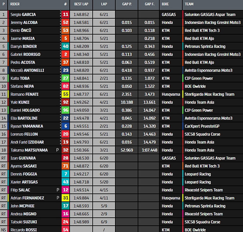 Sergio García prend le commandement et franchit la ligne droite d’arrivée en premier, mais un incident de course impliquant Ayumu Sasaki, Dennis Foggia et Xavier Artigas loin des caméras entraîne la sortie du drapeau rouge et la remise en cause possible du classement provisoire.