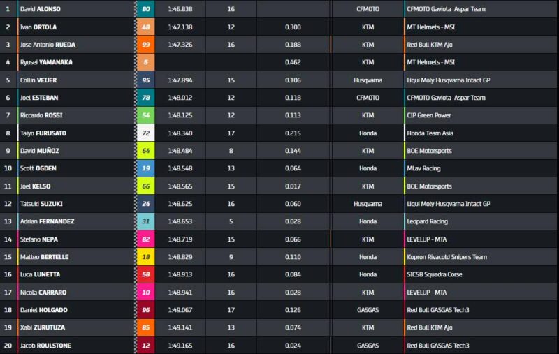 Mais David Alonso est lui aussi en capacité d’améliorer. Lui passe en 1’46 ! Incroyable, mais qui peut arrêter cet homme ? Holgado, en revanche, n’est nulle part, à la 21e place. Au final, le leader du championnat termine à plus de deux secondes du leader David Alonso ! Incroyable. Le Colombien poursuit sa domination sans pareille. Il devance Ivan Ortola et José Antonio Rueda, qui semble bien revenu suite à ses soucis de santé.