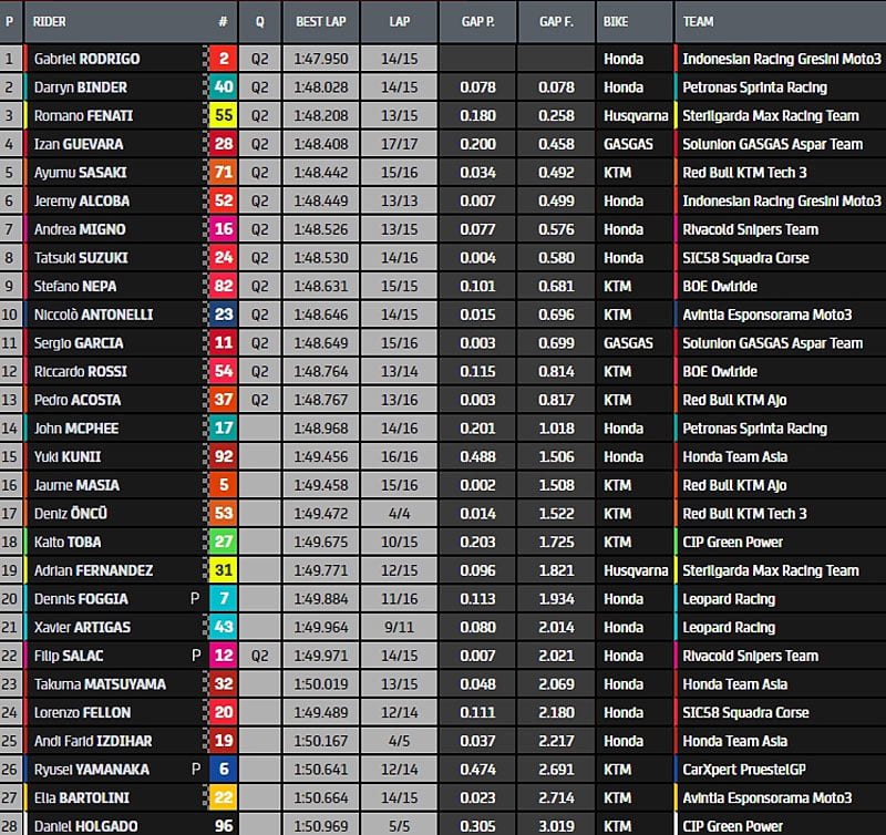 Sous le drapeau à damier, l’Argentin reprend son bien en 1’47.950. Il est le seul sous la barre des 1’48 au tour. Darryn Binder suit et devance Fenati, Guevara et Sasaki. Acosta est 13e, devant McPhee, dernier du top 14 qualificatif pour la Q2. Lorenzo Fellon 24e.