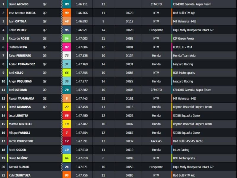 Personne ne peut aller le chercher. José Antonio Rueda est deuxième, méritant, alors qu’Ivan Ortola échoue en troisième place. Daniel Holgado est relégué à la 22e place, mais heureusement, son temps d’hier lui permet d’accéder à la Q2.