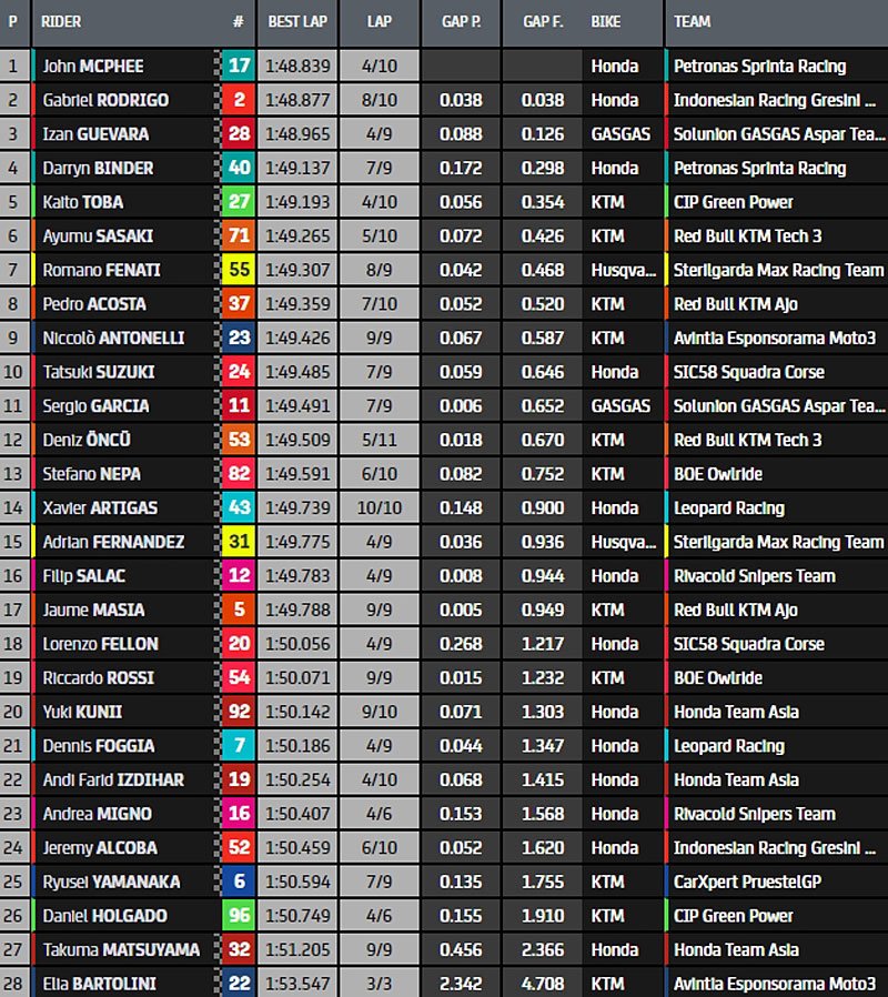 Son coéquipier Darryn Binder (KTM, Petronas Sprinta Racing, #40) se place en septième position et sera rejoint sur la troisième ligne de la grille par Tatsuki Suzuki (Honda, SIC58 Squadra Corse, #24) et Jaume Masià (KTM, Red Bull KTM Ajo, #5), après que l’Espagnol ait dû passer par la Q1.
