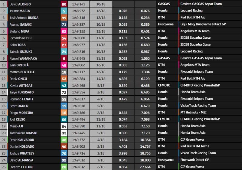 Dernier tour de folie ! Daniel Holgado chute au virage n°10 alors qu’il ne reste que quelques virages à disputer ! Dans les derniers tournants, c’est David Alonso, le vainqueur de Silverstone, qui s’impose au grand dam de David Muñoz, qui, lui aussi, connaît une chute à quelques mètres de la ligne ! Poussé par Deniz Öncü, le Turc écope de deux long laps de pénalités, soit six secondes ajoutées à son temps de course. Au bout de l’effort, c’est Alonso qui s’impose dans ce Grand Prix fabuleux, la troisième victoire d’affilée ici pour Aspar !
