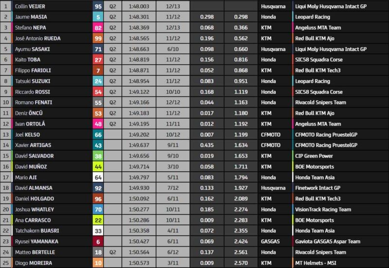 Tous les pilotes améliorent à une minute de la fin. Stefano Nepa (KTM Angeluss MTA Team) est brièvement premier, mais laisse sa place à Collin Veijer, avec le tour le plus rapide du week-end. Mais ce n’est pas fini, tous ont encore un tour pour se hisser au sommet de la feuille de temps. En raison d’un drapeau jaune suite à la chute d’Iván Ortolá, personne ne peut améliorer et cela ne fait pas les affaires de Daniel Holgado (Red Bull KTM tech3) ! Piégé, il devra passer par la Q1.