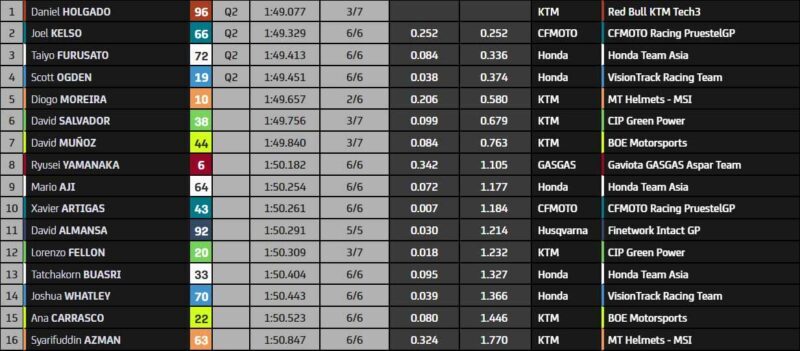 Dans les derniers instants, la situation s’affole. Diogo Moreira et David Muñoz sont pris au piège, alors qu’ils ont voulu prendre une roue ! Daniel Holgado est le premier des qualifiés, suivi de Joel Kelso, Taiyo Furusato (Honda Team Asia) et Scott Ogden (Honda VisionTrack Racing Team). Lorenzo Fellon (KTM CIP Green Power) est 12e de la séance.