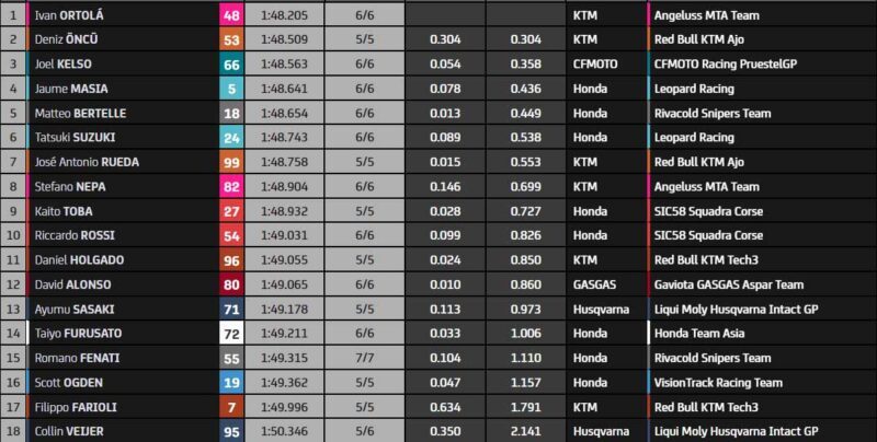 Et c’est Iván Ortolá (KTM Angeluss MTA Team) qui termine premier de ce tour d’anthologie ! Il s’agit de sa première pole position en carrière, bravo à lui. Deniz Öncü est deuxième, alors que Jaume Masiá échoue en quatrième position. Une 13e position sonne comme une déception pour Ayumu Sasaki, le serial poleman de cette saison. Daniel Holgado ne fait pas beaucoup mieux avec cette 11e place.