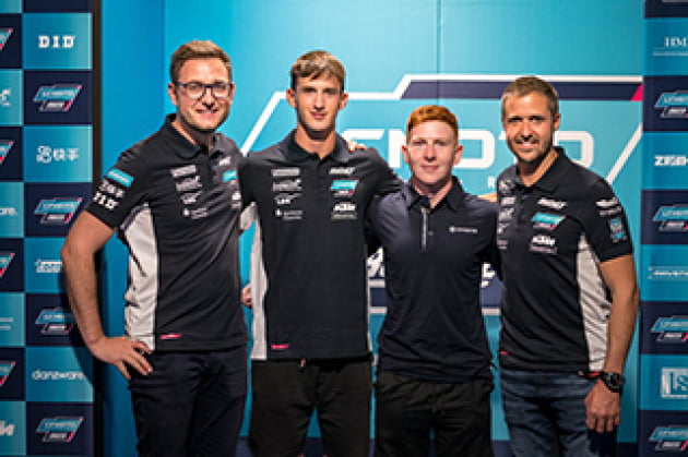 Avec les deux pilotes espagnols #99 Carlos Tatay et #43 Xavier Artigas, le directeur sportif et ancien champion du monde 125cc Tom Lüthi et le patron de l’équipe Florian Prüstel, une formation rapide et compétitive a été créée.